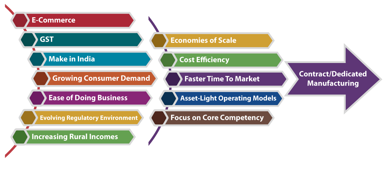In this model, the manufacturing facility is not entirely dedicated to a single principal company but the capacity is shared by various companies for a longer period of agreement. The Anchor tenant enjoys all the privileges of a principal, however there will be a few minor partners sharing the facility. This helps to spread the overheads and bring down the costs.